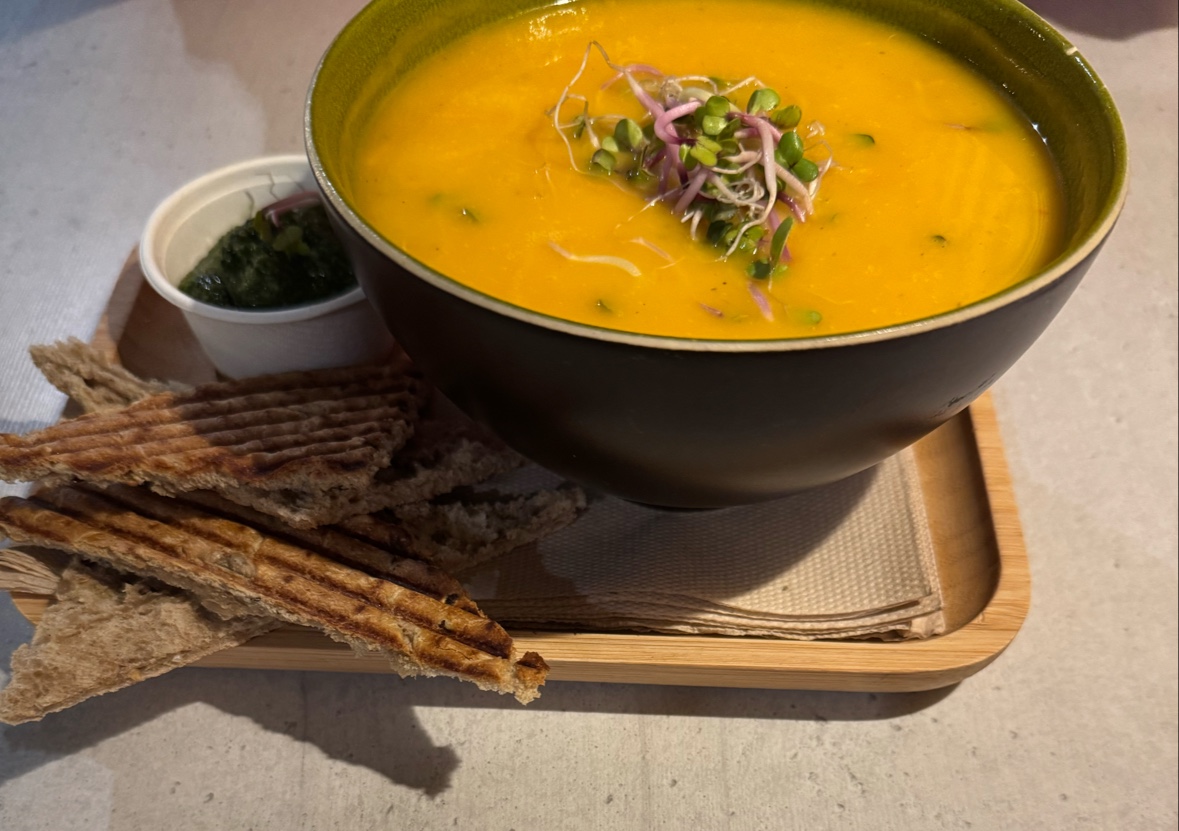 One of the standout dishes on the menu is the Acai Power Bowl. Packed with vibrant, nutrient-rich ingredients, this bowl is a great way to start your day or refuel after a workout. With a base of acai berries, topped with granola, fresh fruits, and a drizzle of honey, it’s the ultimate treat for anyone who loves healthy, yet satisfying meals. If you're in the mood for something warm and comforting, the Pumpkin Soup is a must-try. Smooth and velvety, it’s the perfect dish to enjoy on a chilly day while savoring the cozy ambiance of the restaurant.